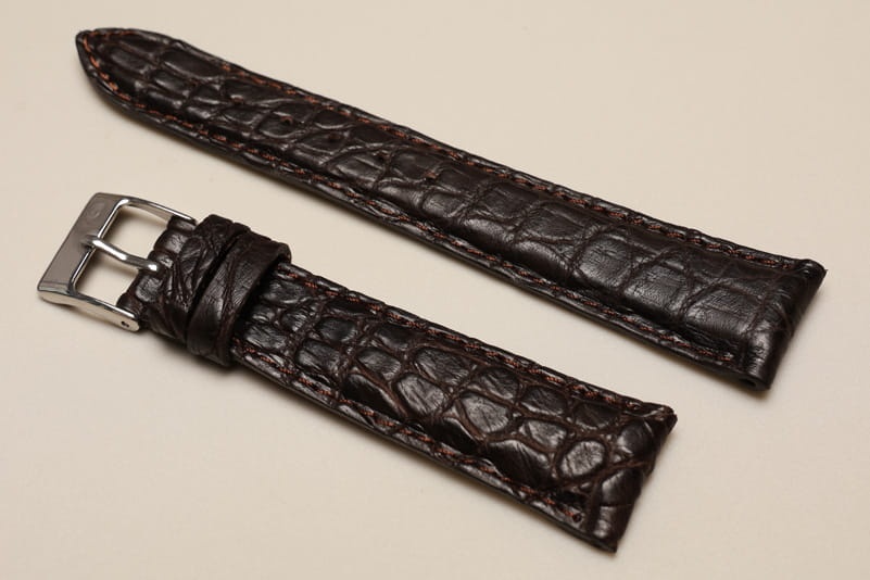 Pasek wykonany ze oryginalnej skóry krokodyla. Wykończenie matowe. Licowa, gładka futrówka. Pogrubiany do 5mm przy mocowaniu, dalej pasek ma 3,5mm grubości. Stosunkowo miękki. Przeszyty nicią pod kolor paska. Dwie szlufki, stalowa klamerka. Pasek do markowych, klasycznych zegarków.
