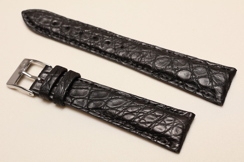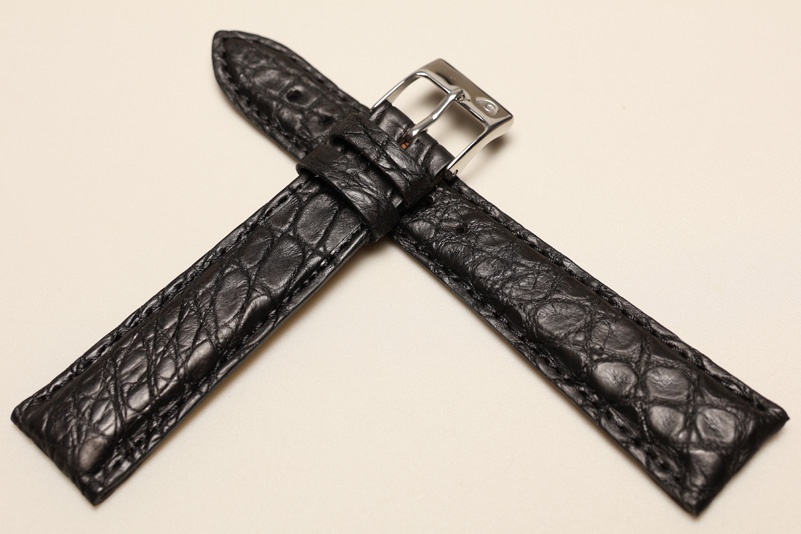 Pasek wykonany ze oryginalnej skóry krokodyla. Wykończenie matowe. Licowa, gładka futrówka. Pogrubiany do 5mm przy mocowaniu, dalej pasek ma 3,5mm grubości. Stosunkowo miękki. Przeszyty nicią pod kolor paska. Dwie szlufki, stalowa klamerka. Pasek do markowych, klasycznych zegarków.