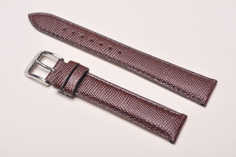 Wykonany ze skóry naturalnej, tłoczonej na wzór skóry jaszczurki. Przeszyty nicią pod kolor paska. Lekko pogrubiany, brzegi paska malowane farbą. Dwie szlufki, stalowa klamerka.