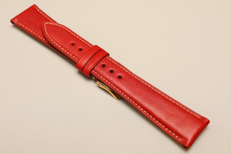 Wykonany z pięknej cielęcej skóry o naturalnym, matowym licu. Przeszyty drobną, jasną nicią. Delikatnie pogrubiany do 4mm. Dość miękki i miły w dotyku. Dwie szlufki, stalowa klamerka.