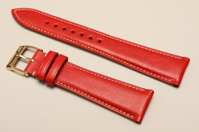 Wykonany z pięknej cielęcej skóry o naturalnym, matowym licu. Przeszyty drobną, jasną nicią. Delikatnie pogrubiany do 4mm. Dość miękki i miły w dotyku. Dwie szlufki, stalowa klamerka.