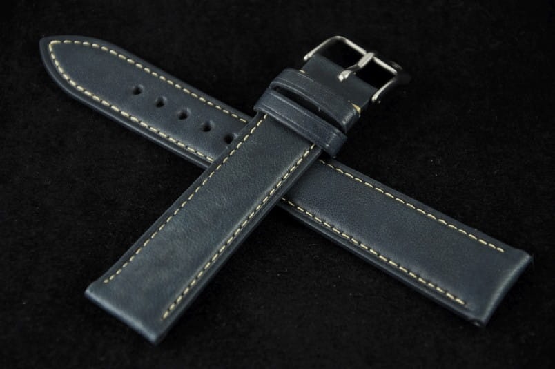 Wykonany z pięknej cielęcej skóry o naturalnym, matowym licu. Przeszyty drobną, jasną nicią. Delikatnie pogrubiany do 4mm. Dość miękki i miły w dotyku. Dwie szlufki, stalowa klamerka.