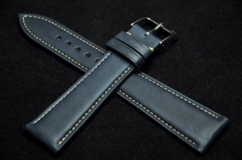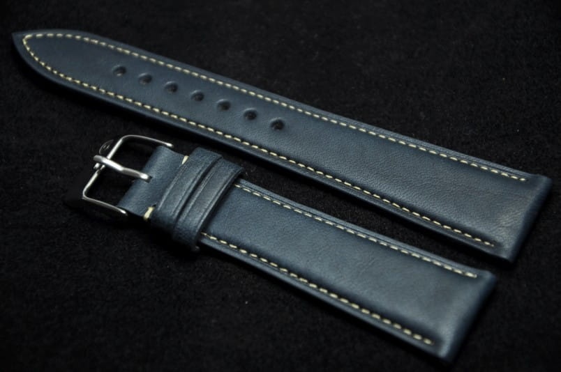 Wykonany z pięknej cielęcej skóry o naturalnym, matowym licu. Przeszyty drobną, jasną nicią. Delikatnie pogrubiany do 4mm. Dość miękki i miły w dotyku. Dwie szlufki, stalowa klamerka.