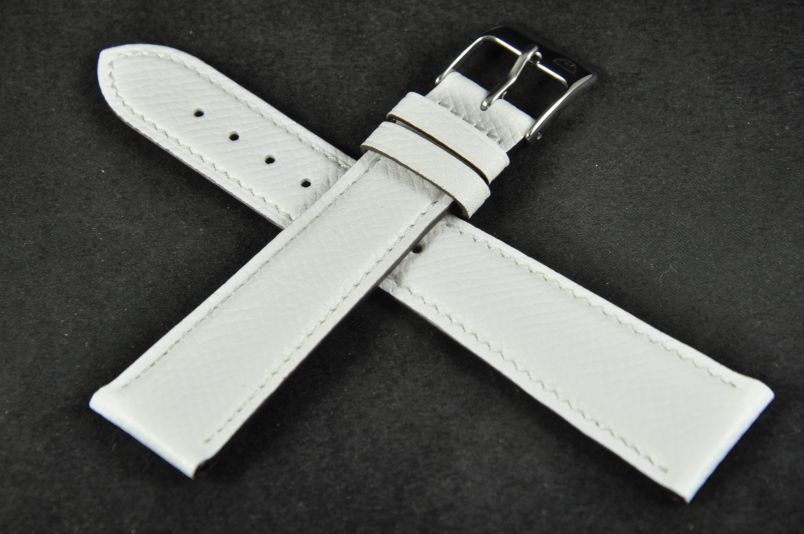 Wykonany ze skóry naturalnej o delikatnej fakturze typu "Hermes". Przeszyty nieco jaśniejszą, kontrastową nicią. Lekko pogrubiany, brzegi paska malowane ciemną farbą. Dwie szlufki, stalowa klamerka.