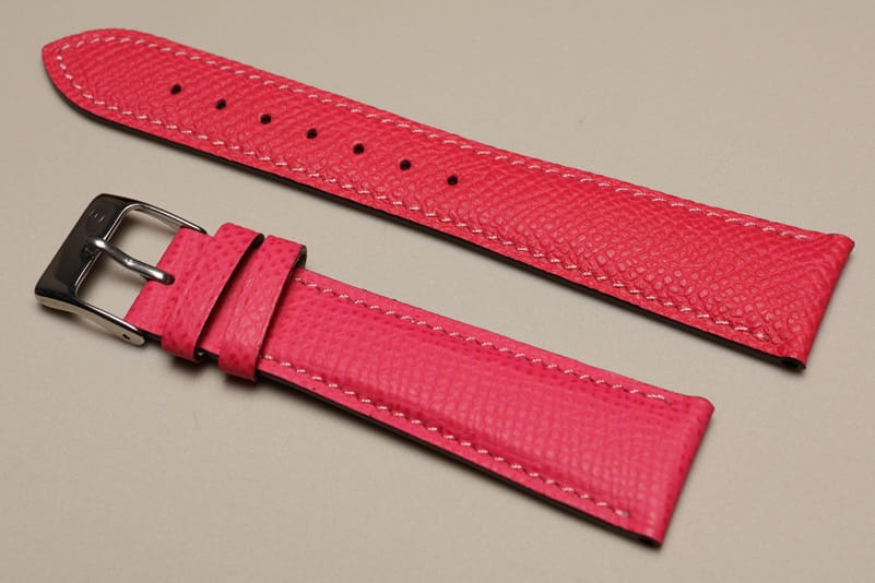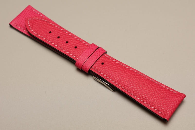 Wykonany ze skóry naturalnej o delikatnej fakturze typu "Hermes". Przeszyty nieco jaśniejszą, kontrastową nicią. Lekko pogrubiany, brzegi paska malowane ciemną farbą. Dwie szlufki, stalowa klamerka.