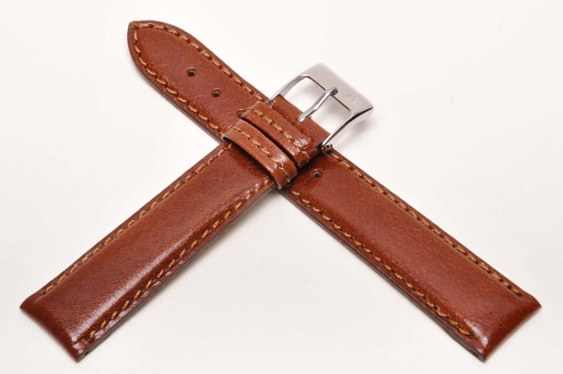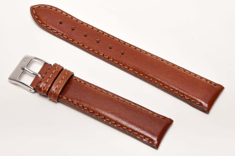 Wykonany ze skóry naturalnej, delikatny, gładki pasek. Płaski, grubość od strony zegarka 3,50mm, dalej 2,80mm. Wykończenie na półpołysk. Dwie szlufki, stalowa klamerka. Zwężany do 16mm przy klamerce.