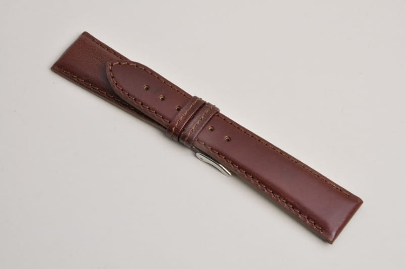 Wykonany ze skóry naturalnej, delikatny, gładki pasek. Płaski, grubość od strony zegarka 3,50mm, dalej 2,80mm. Wykończenie na półpołysk. Dwie szlufki, stalowa klamerka. Zwężany do 18mm przy klamerce.