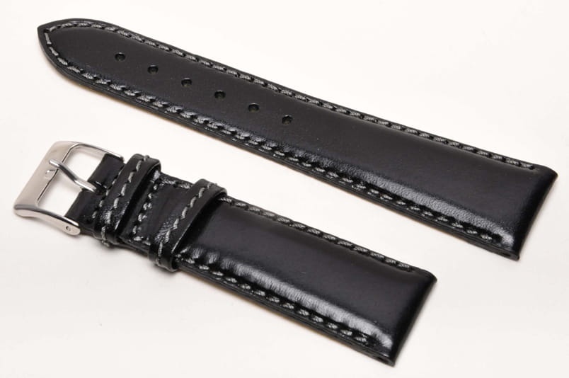 Wykonany ze skóry naturalnej, delikatny, gładki pasek. Płaski, grubość od strony zegarka 3,50mm, dalej 2,80mm. Wykończenie na półpołysk. Dwie szlufki, stalowa klamerka. Zwężany do 18mm przy klamerce.