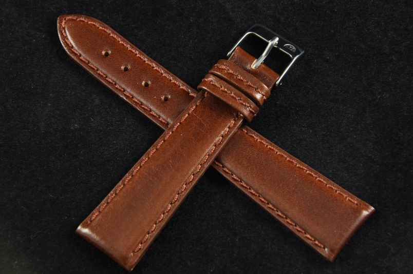 Wykonany ze skóry naturalnej, delikatny, gładki pasek. Płaski,grubość od strony zegarka 3,50mm dalej 2,80mm. Wykończenie półpołysk. Dwie szlufki, stalowa klamerka. Zwężany do 16mm przy klamerce. Taki fason daje możliwość zamiany oryginalnej klamerki od markowych zegarków.