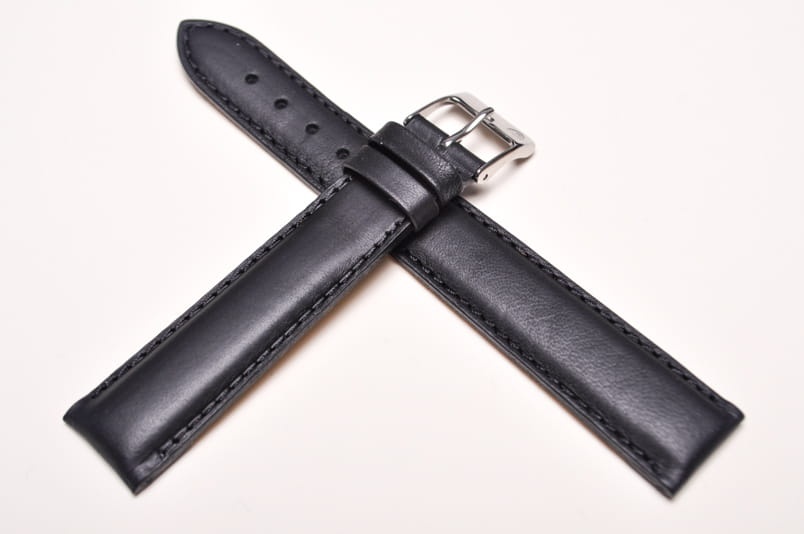 Wykonany ze skóry naturalnej, delikatny, gładki pasek. Miękki, płaski, grubość od strony zegarka 4,20mm dalej 3,70mm. Wykończenie półmatowe. Dwie szlufki, stalowa klamerka.