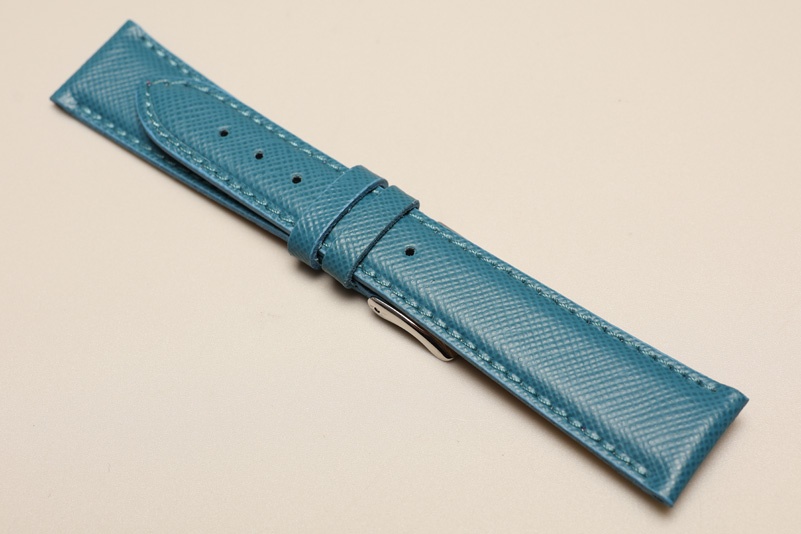 Wykonany ze skóry naturalnej o delikatnej fakturze typu Saffiano. Przeszyty nicią pod kolor paska. Lekko pogrubiany, brzegi paska malowane farbą. Dwie szlufki, stalowa klamerka.