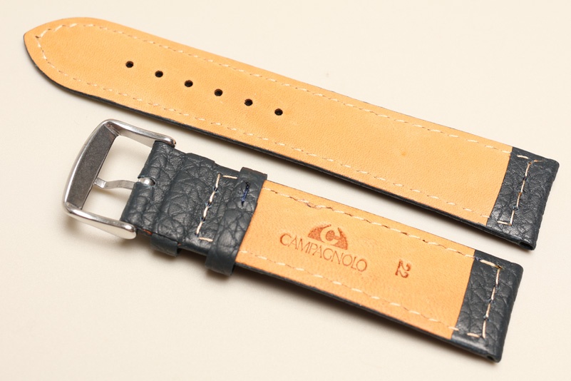 Wykonany z byczej skóry, z delikatnie zaznaczonym jej wzorem. Spód ze skóry licowej. Przeszyty nicią w kolorze paska. Wypukły, grubość od strony zegarka 4,40mm dalej 3,50mm. Stosunkowo miękki. Wykończenie półmatowe. Dwie szlufki, stalowa klamerka.