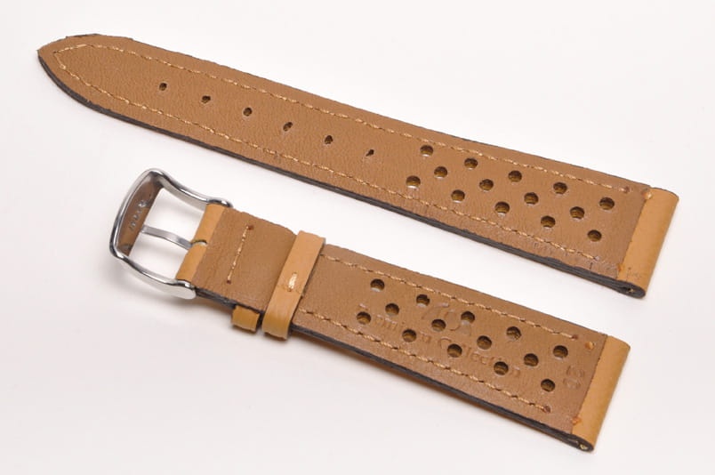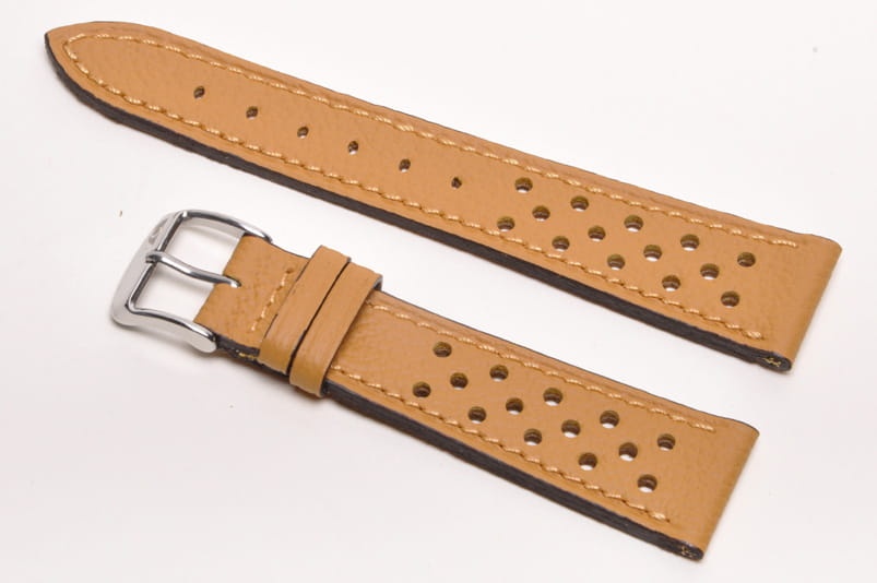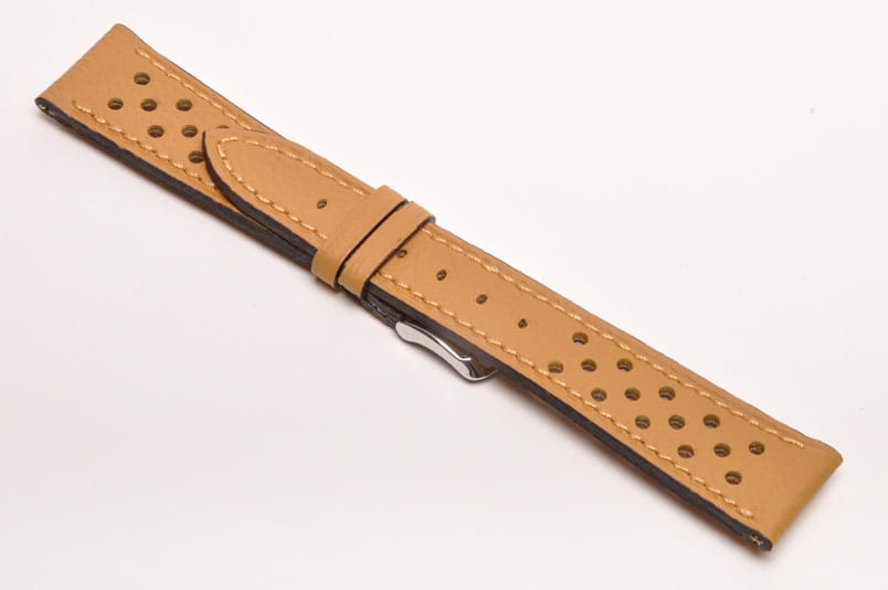Wierzch paska wykonany z naturalnej skóry cielęcej o matowym wykończeniu i naturalnej strukturze. Futrówka z delikatnej w dotyku, najwyższej jakości skóry używanej przez uznanych producentów m.in. Hermes. Płaski i miękki. Przeszyty nicią. Brzegi paska malowane. Charakterystyczne dziurki typu tropic. Dwie szlufki, metalowa klamerka. Mocno zwężany, pasek do starych chronografów typu Heuer, Breitling.