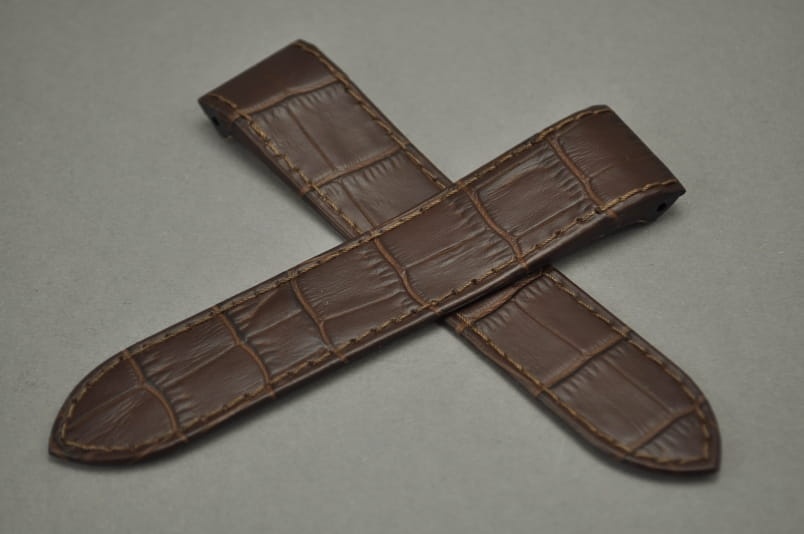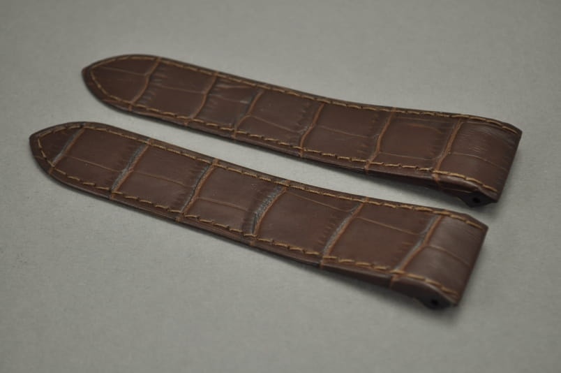 Wykonany z naturalnej brązowej skóry. Matowy, imitacja skóry aligatora. Przeszyty nicią w kolorze paska. Pogrubiany od strony zegarka do 4mm. Część do mocowania zamka grubości 1,8mm. Brak dziurek. Dedykowany do zapięcia Cartier.