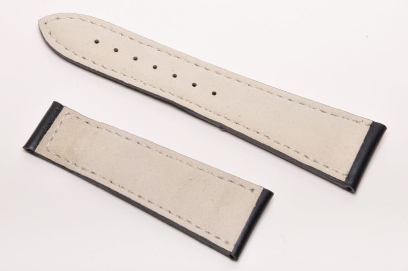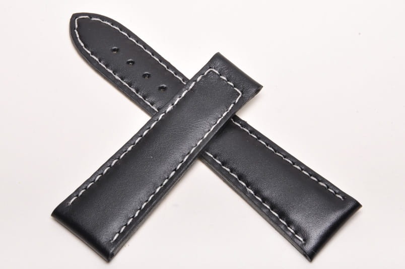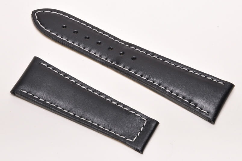 Wykonany z naturalnej skóry. Matowy, gładki. Przeszywany białą nicią. Pogrubiany przy zegarku do 5,5mm, przy zapięciu 3,0mm grubości. Brak szlufek i klamerki.