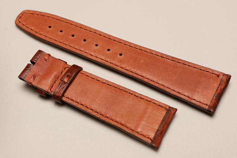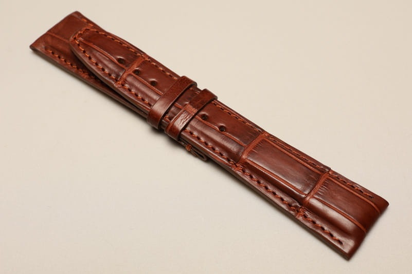 Pasek wykonany z oryginalnej skóry aligatora. Ładne ułożenie łusek. Satynowe wykończenie. Futrówka licowa. Pogrubiany do 5mm przy mocowaniu, dalej pasek ma 3,5mm grubości. Stosunkowo miękki. Przeszyty nicią pod kolor paska. Dwie szlufki. Pasek do markowych zegarków, np. IWC Schaffhausen model Portuguese czy Portofino.