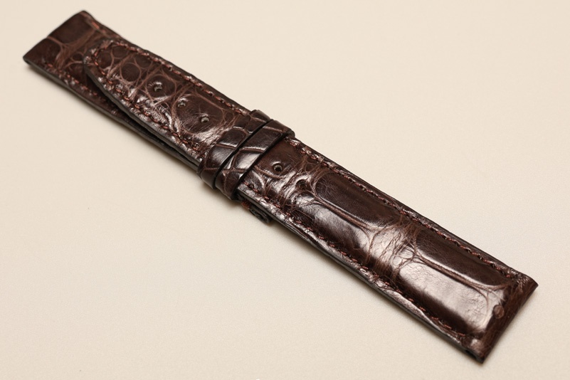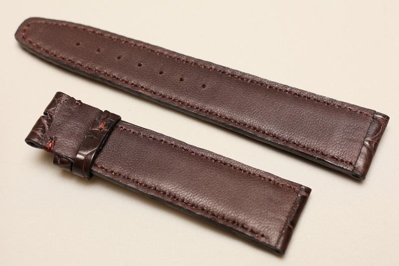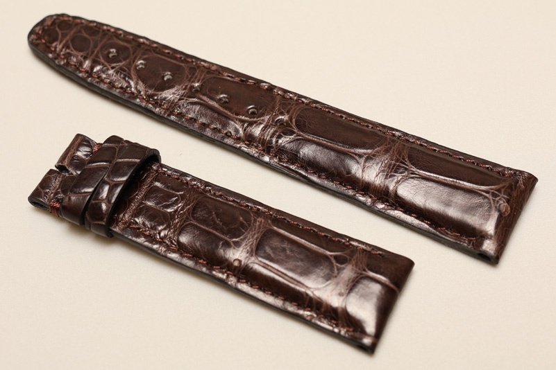 Pasek wykonany z oryginalnej skóry aligatora. Ładne ułożenie łusek. Matowe wykończenie. Futrówka licowa. Pogrubiany do 4,6mm przy mocowaniu, dalej pasek ma 3mm grubości. Stosunkowo miękki. Przeszyty nicią pod kolor paska, dodatkowe przeszycie przy klamerce. Dwie szlufki, stalowa klamerka. Pasek do markowych zegarków, np. IWC Schaffhausen model Portuguese czy Portofino.