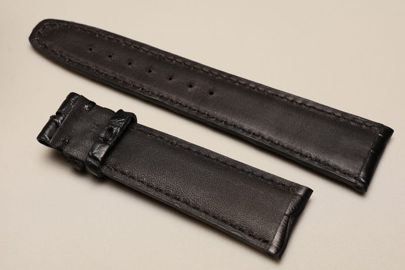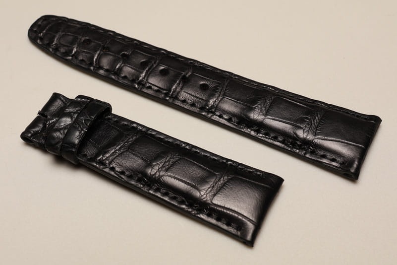 Pasek wykonany z oryginalnej skóry aligatora. Ładne ułożenie łusek. Satynowe wykończenie. Futrówka czarna, licowa. Pogrubiany do 5mm przy mocowaniu, dalej pasek ma 3,5mm grubości. Stosunkowo miękki. Przeszyty czarną nicią. Dwie szlufki. Pasek do markowych zegarków, np. IWC Schaffhausen model Portuguese czy Portofino.