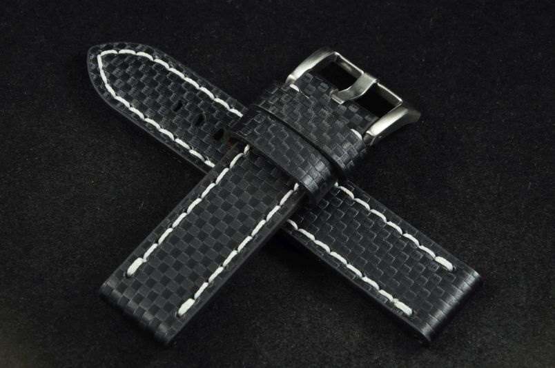 Skórzany, masywny pasek z tłoczonym wzorem włókna węglowego. Przyszyty grubą nicią w kolorze białym. Podwójna szlufka, stalowa, masywna klamerka. Pasek jednolitej grubości na całej długości - ok. 5mm. Pasek nadający typowo sportowy charakter niemal każdemu zegarkowi.