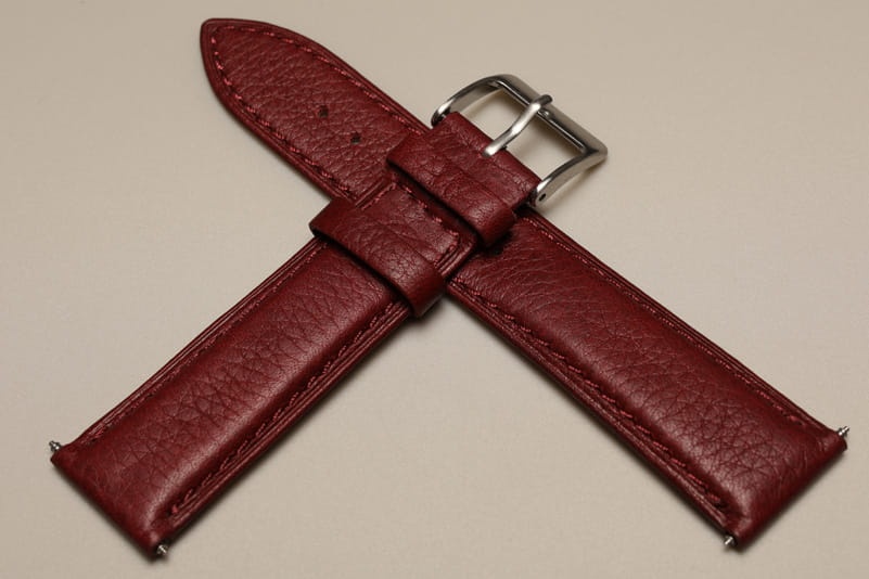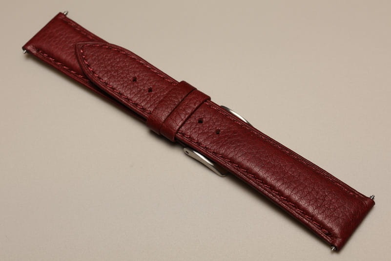 Pasek skórzany, matowy ze wzorem skóry byka, grubość od strony zegarka 3,6mm dalej poniżej 2mm. Wyjątkowo miękki. W kolorze czerwonym. Przeszyty nicią w kolorze paska. Podwójna szlufka, stalowa klamerka.