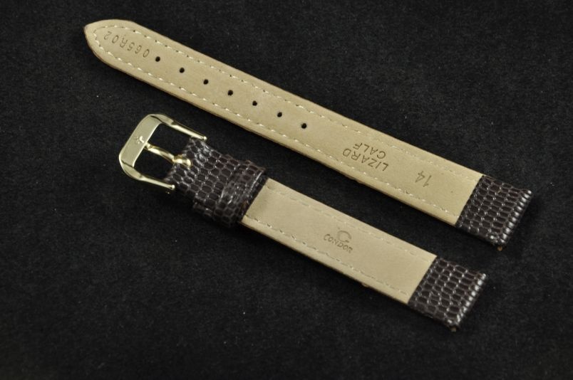 Pasek do zegarków z mocowaniem 14mm. Wykonany ze skóry naturalnej, wzór skóry jaszczurki. Miękki,delikatnie pogrubiony do 3,00mm. Przeszywany nicią w kolorze paska.Wykończenie satynowe. Podwójna szlufka, stalowa klamerka.