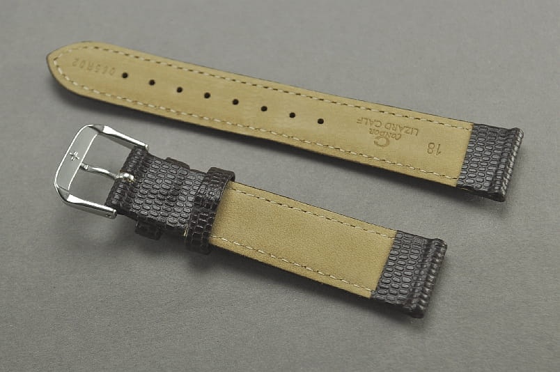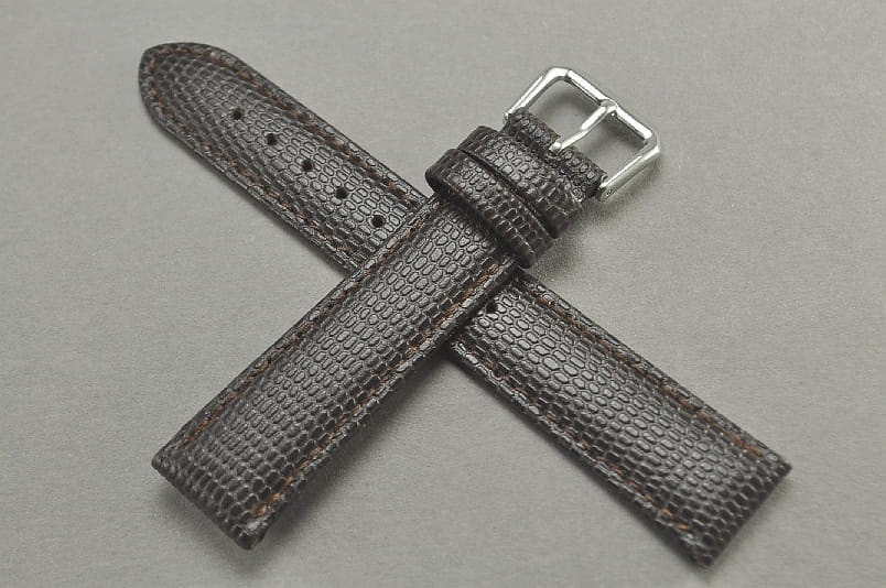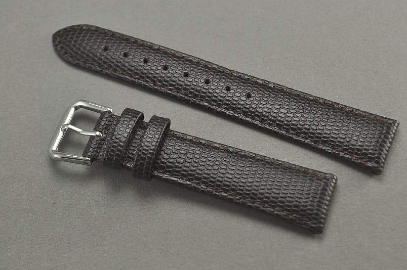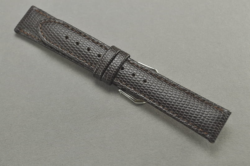 Pasek do zegarków z mocowaniem 16mm. Wykonany ze skóry naturalnej, wzór skóry jaszczurki. Miękki,delikatnie pogrubiony do 3,00mm. Przeszywany nicią w kolorze paska.Wykończenie satynowe. Podwójna szlufka, stalowa klamerka.