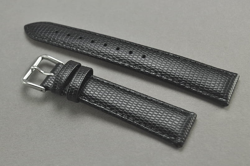 Pasek do zegarków z mocowaniem 16mm. Wykonany ze skóry naturalnej, wzór skóry jaszczurki. Miękki,delikatnie pogrubiony do 3,00mm. Przeszywany nicią w kolorze paska.Wykończenie satynowe. Podwójna szlufka, stalowa klamerka.