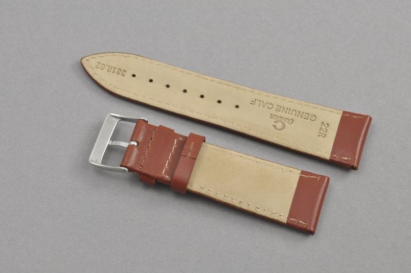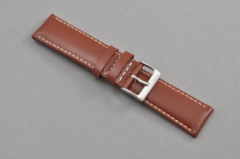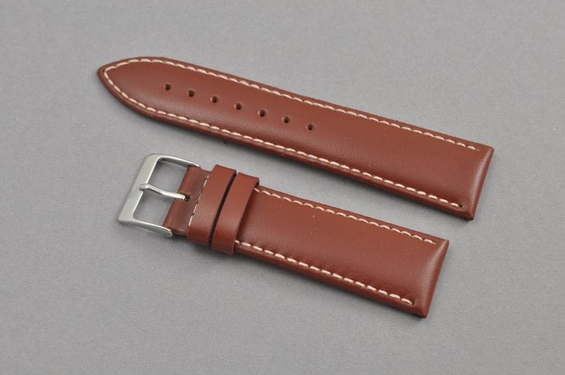 Pasek do zegarków z mocowaniem 22mm. Wykonany ze skóry naturalnej w kolorze koniakowym, gładki, wykończenie półpołysk. Przeszywany białą nicią. Pogrubiany od 5,7mm przy zegarku do 3mm na końcu. Podwójna szlufka, stalowa klamerka.