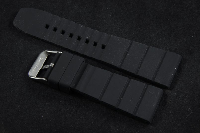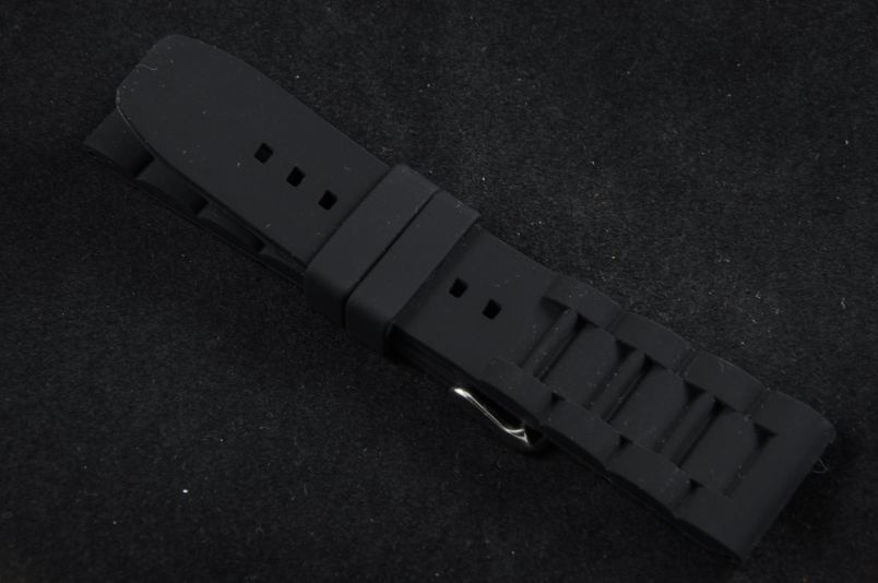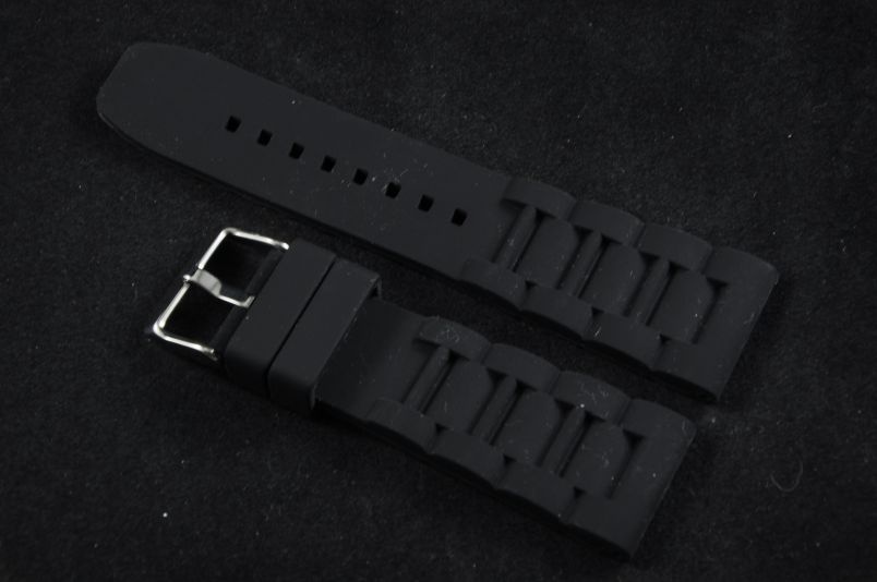 Wykonany z miękkiego, czarnego silikonu. Matowy i gładki. Od strony zegarka wzór imitujący 4 ogniwa bransolety. Grubość 6,00mm do 3,50 na końcu . Stalowa klamerka, podwójna szlufka. Idealny do sportów wodnych i nurkowania. Pasuje do większości zegarków z mocowaniem 26mm.