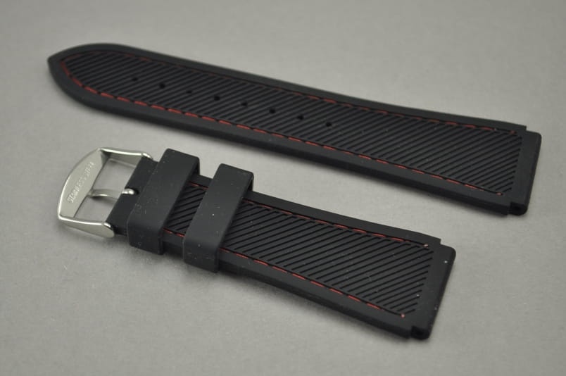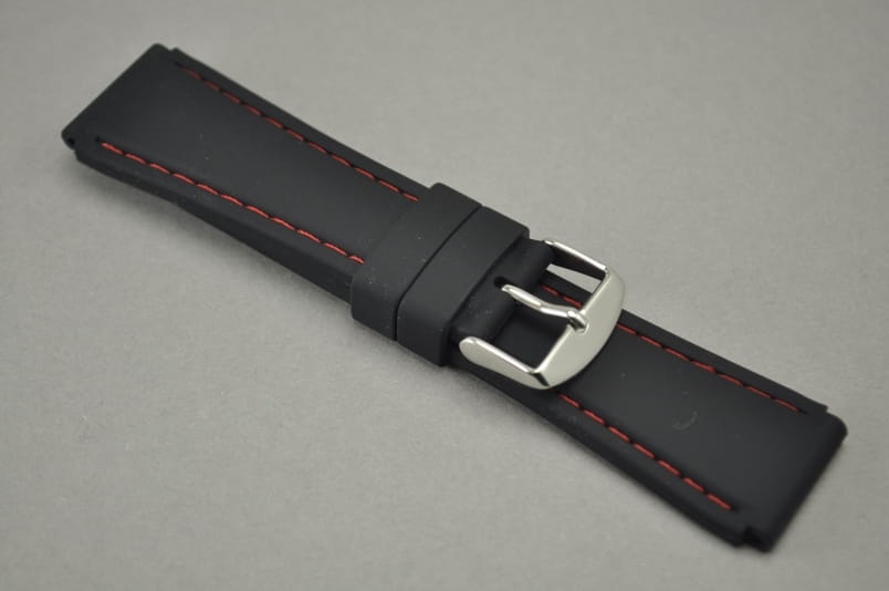 Wykonany z miękkiego, czarnego silikonu. Matowy i gładki. Pasek poszerzany zaraz za mocowaniem do 24mm. Przeszyty czerwoną nicią. Stalowa klamerka, podwójna szlufka. Idealny do sportów wodnych i nurkowania. Pasuje do większości zegarków z mocowaniem 20mm.