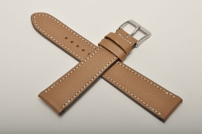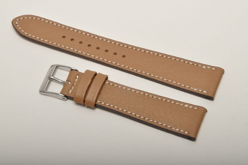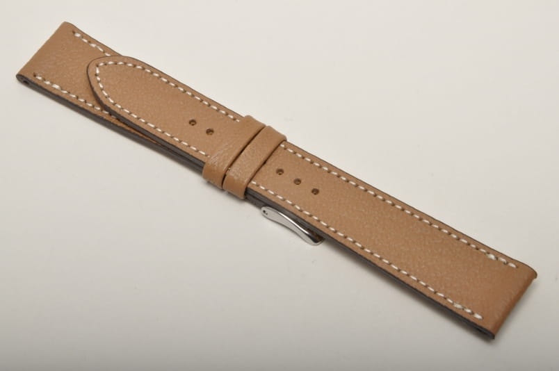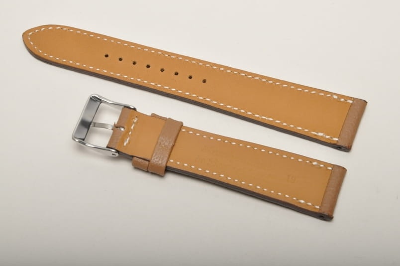 Wierzch paska wykonany z naturalnej skóry cielęcej, z delikatną fakturą Wykończenie na półpołysk. Futrówka z delikatnej w dotyku, najwyższej jakości skóry używanej przez uznanych producentów m.in. Hermes. Płaski i miękki. Pasek przeszyty białą nicią. Dwie szlufki, metalowa klamerka. Mocno przewężany, elegancki pasek do cienkich oraz mniej typowych zegarków, nadający im klasyczny charakter.