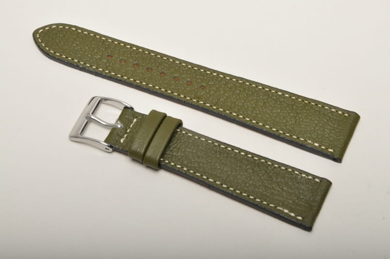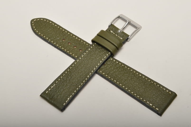 Wierzch paska wykonany z naturalnej skóry cielęcej, z delikatną fakturą Wykończenie na półpołysk. Futrówka z delikatnej w dotyku, najwyższej jakości skóry używanej przez uznanych producentów m.in. Hermes. Płaski i miękki. Pasek przeszyty białą nicią. Dwie szlufki, metalowa klamerka. Mocno przewężany, elegancki pasek do cienkich oraz mniej typowych zegarków, nadający im klasyczny charakter.