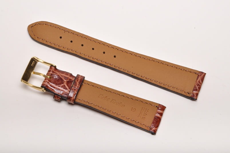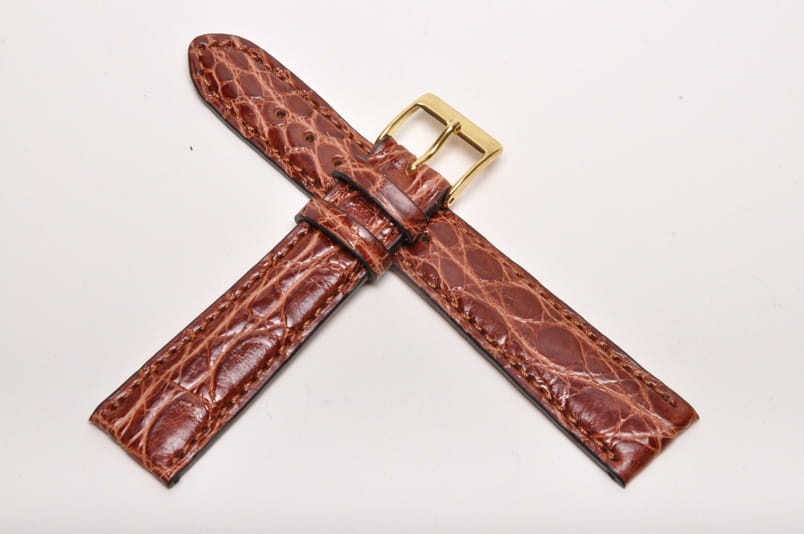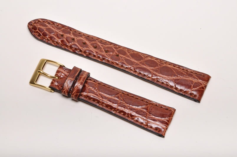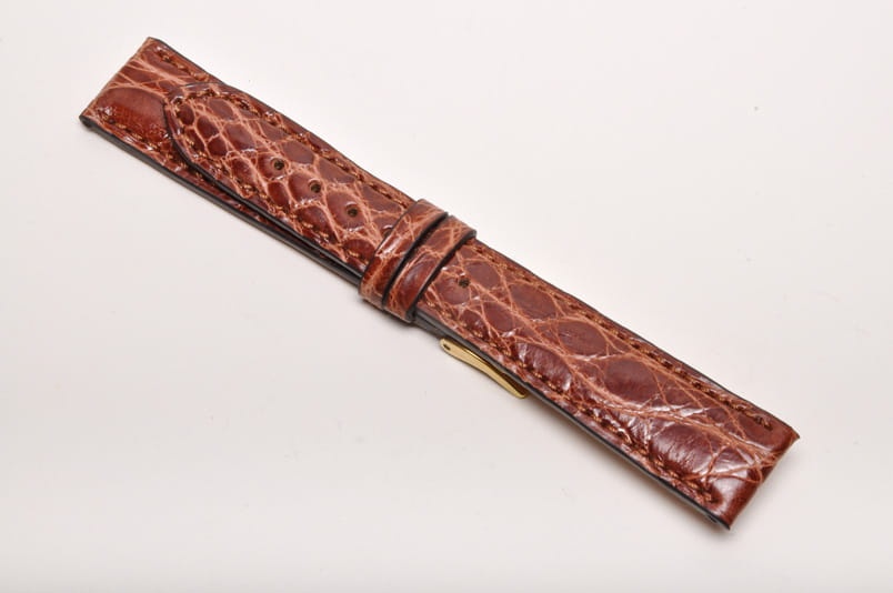 Pasek wykonany ze oryginalnej skóry krokodyla. Wykończenie na wysoki połysk. Licowa, gładka futrówka. Pogrubiany delikatnie przy mocowaniu. Miękki. Przeszyty nicią pod kolor paska. Dwie szlufki, stalowa klamerka. Pasek do markowych, klasycznych zegarków.