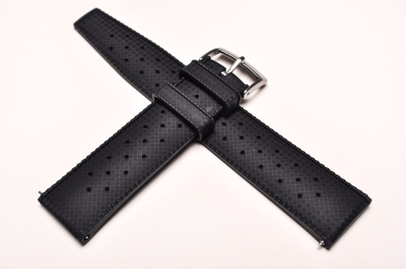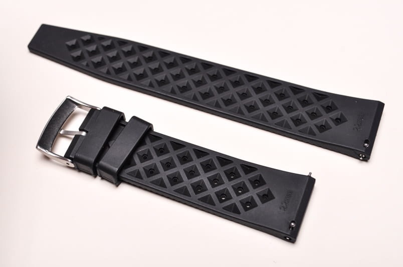 Pasek typu tropic, z charakterystycznymi otworami, wykonany z kauczuku wysokiej jakości. Od strony wierzchniej brzeg paska lekko podniesiony, na spodzie profil zapewniający wentylację. Dwie ruchome szlufki, stalowa klamerka. Fason paska (węższy i równo ucięty koniec) nawiązuje do modeli stosowanych w zegarkach Rolex czy Tudor. Wbudowane teleskopy do szybkiego montażu.