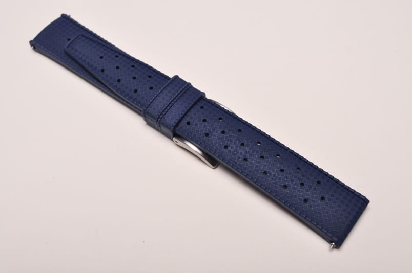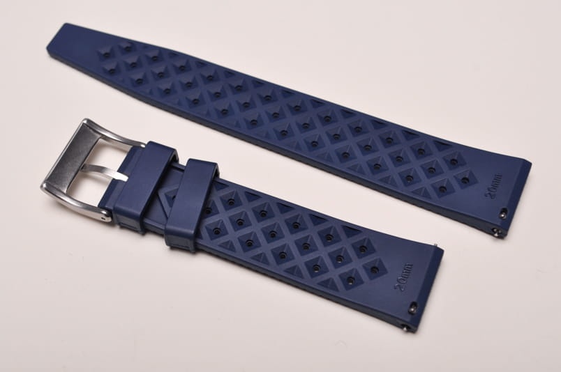 Pasek typu tropic, z charakterystycznymi otworami, wykonany z kauczuku wysokiej jakości. Od strony wierzchniej brzeg paska lekko podniesiony, na spodzie profil zapewniający wentylację. Dwie ruchome szlufki, stalowa klamerka. Fason paska (węższy i równo ucięty koniec) nawiązuje do modeli stosowanych w zegarkach Rolex czy Tudor. Wbudowane teleskopy do szybkiego montażu.