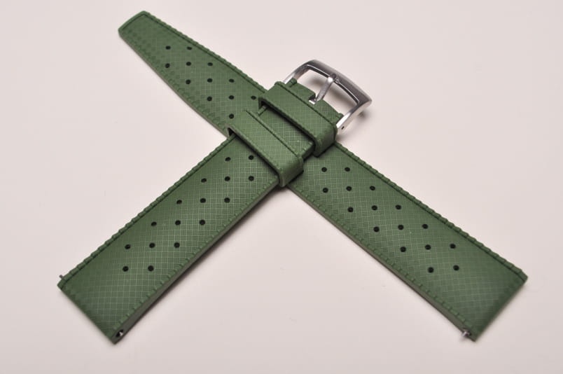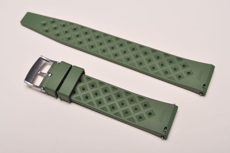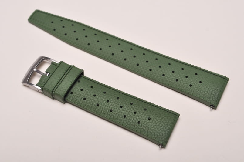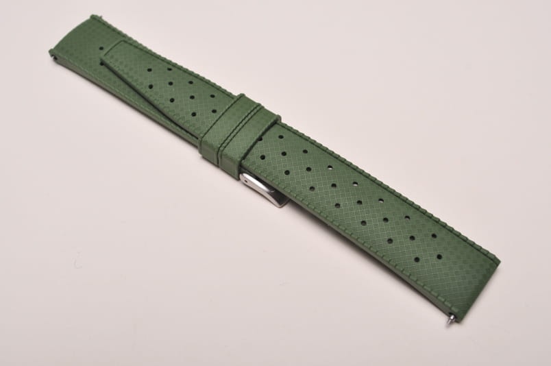 Pasek typu tropic, z charakterystycznymi otworami, wykonany z kauczuku wysokiej jakości. Od strony wierzchniej brzeg paska lekko podniesiony, na spodzie profil zapewniający wentylację. Dwie ruchome szlufki, stalowa klamerka. Fason paska (węższy i równo ucięty koniec) nawiązuje do modeli stosowanych w zegarkach Rolex czy Tudor. Wbudowane teleskopy do szybkiego montażu.