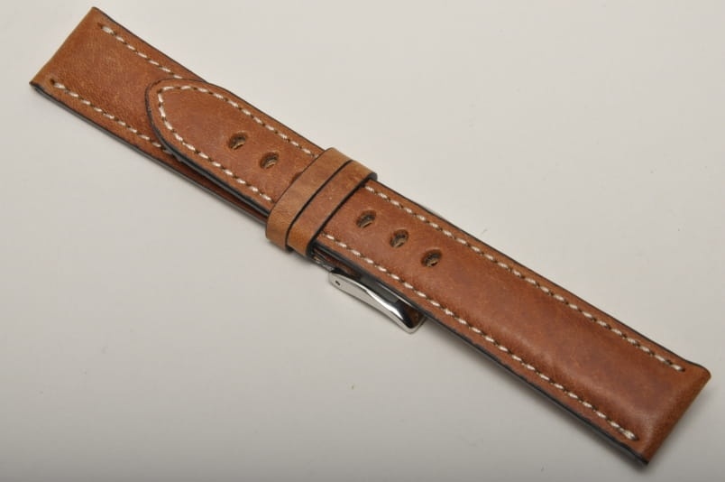 Wykonany ze skóry o naturalnej, ciekawej fakturze. Przeszyty jasną nicią. Pogrubiany do 5mm. Wykończenie matowe. Brzegi malowane na czarno, podwójna szlufka, stalowa klamerka.