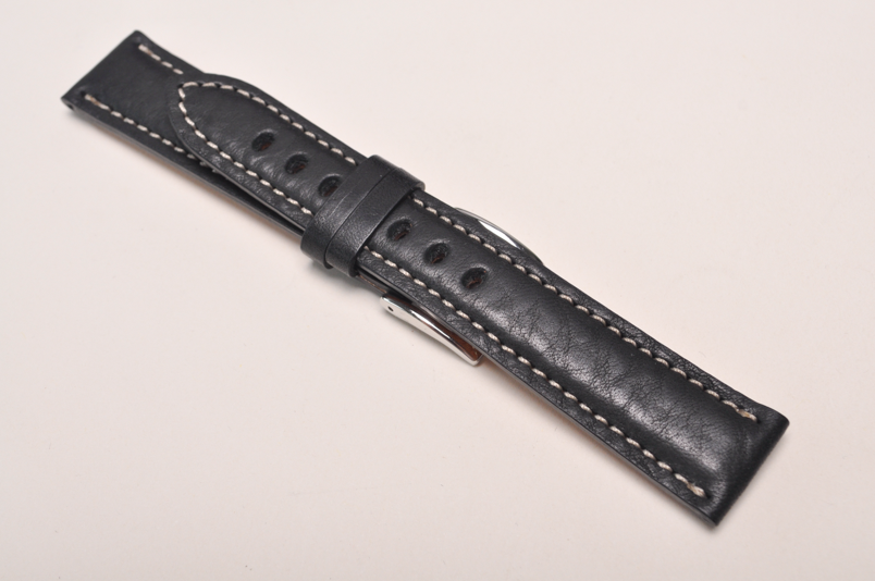 Wykonany ze skóry o naturalnej, ciekawej fakturze. Przeszyty jasną nicią. Pogrubiany do 5mm. Wykończenie matowe. Brzegi malowane na czarno, podwójna szlufka, stalowa klamerka.