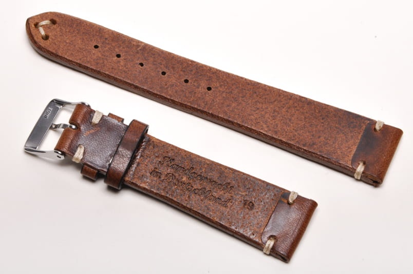 Wykonany z jednego kawałka skóry naturalnej o roślinnej wyprawie. Gładki, o ciekawej fakturze skóry. Ozdobne przeszycia na końcach, nitka w kolorze beżwoym. Miękki, 3,5mm grubości. Wykończenie matowe. Brzegi skóry polerowane.