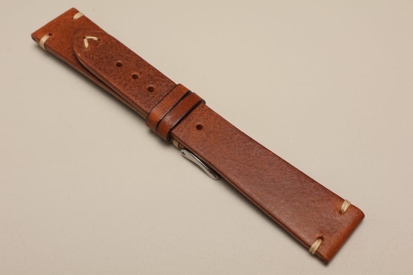 Wykonany z jednego kawałka skóry naturalnej o roślinnej wyprawie. Gładki, o ciekawej fakturze skóry. Ozdobne przeszycia na końcach, nitka w kolorze beżwoym. Miękki, 3,5mm grubości. Wykończenie matowe. Brzegi skóry polerowane.