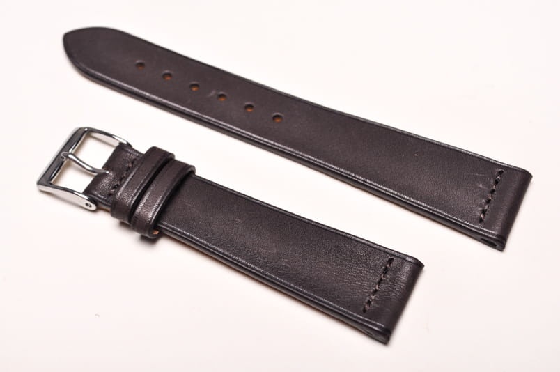 Wykonany ze skóry cielęcej . Gładki, bardzo miękki o grubości tylko 2,3mm. Na końcach od strony zegarka ozdobne a jednocześnie wzmacniające przeszycia delikatną nitką pod kolor. Wykończenie półpołysk..