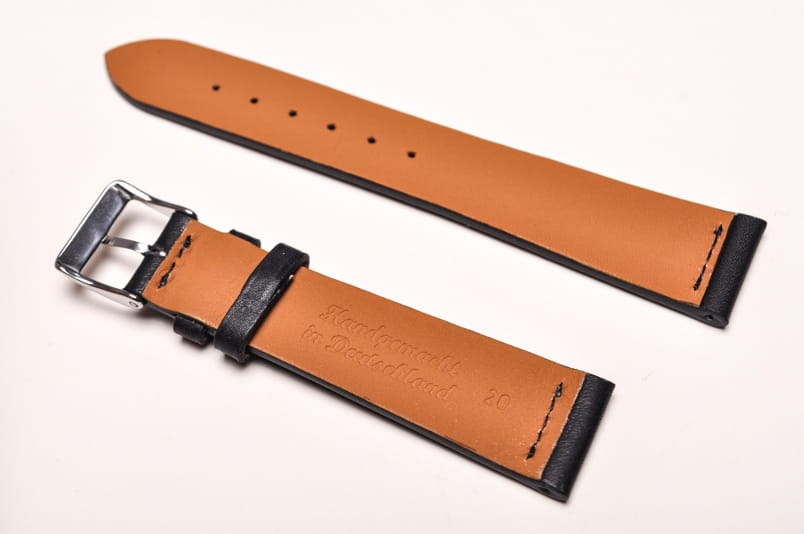 Wykonany ze skóry cielęcej . Gładki, bardzo miękki o grubości tylko 2,3mm. Na końcach od strony zegarka ozdobne a jednocześnie wzmacniające przeszycia delikatną nitką pod kolor. Wykończenie półpołysk..