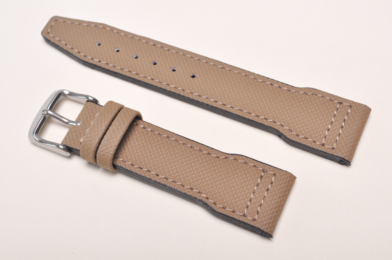 Wykonany z selekcjonowanej skóry bydlęcej, z delikatnym wzorem okrągłych wgłębień przypominających pasek typu rubber. Wytrzymały, wodoodporny, czarna licowa futrówka. Przeszyty dookoła nicią pod kolor. Pogrubiany od 4,7mm przy zegarku do 3,7mm na końcu. Dwie szlufki, stalowa klamerka.