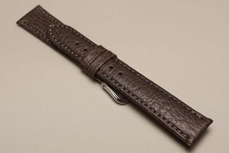 Wykonany ze skóry o naturalnej fakturze. Przeszyty nicią pod kolor paska. Dość miękki, 3,2mm grubości. Wykończenie matowe. Brzegi zawijane, podwójna szlufka, stalowa klamerka.Wersja krótka XS.