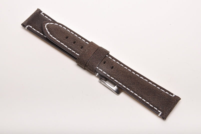Wykonany ze skóry naturalnej typu zamsz. Przeszyty białą nicią. Pogrubiany do 4mm. Wykończenie matowe. Brzegi malowane, podwójna szlufka, stalowa klamerka.