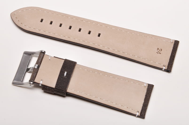 Wykonany ze skóry naturalnej typu zamsz. Przeszyty białą nicią. Pogrubiany do 4mm. Wykończenie matowe. Brzegi malowane, podwójna szlufka, stalowa klamerka.