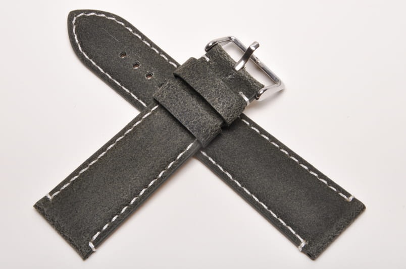 Wykonany ze skóry naturalnej typu zamsz. Przeszyty białą nicią. Pogrubiany do 4mm. Wykończenie matowe. Brzegi malowane, podwójna szlufka, stalowa klamerka.