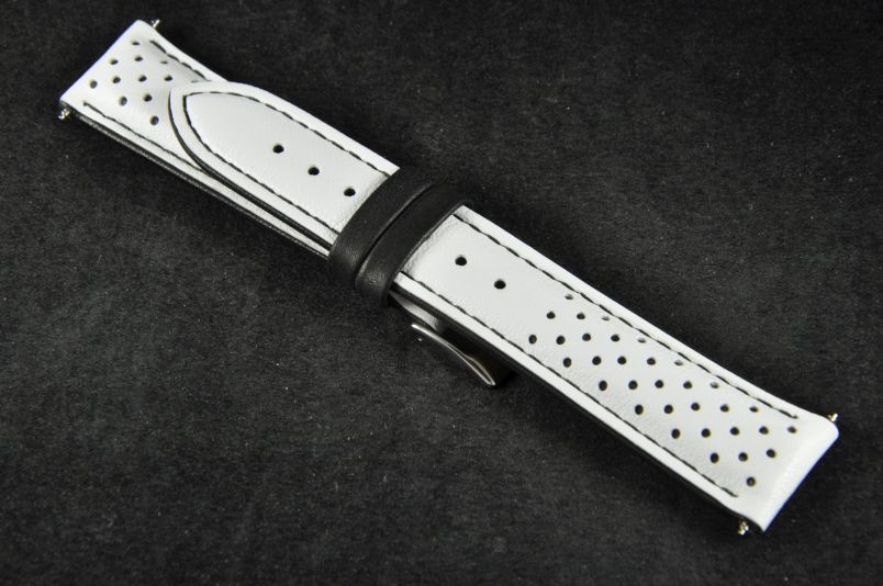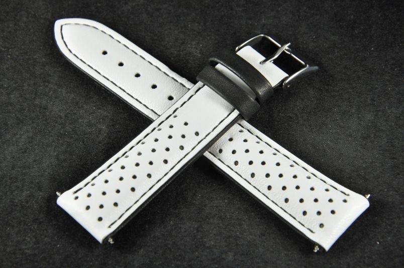 Skórzany pasek wykonany ze skóry typu nubuk. Perforowany wierzch z widoczną kolejną, kolorową warstwą skóry. Mocno pogrubiany do 5,5mm, przy zapięciu pocieniany do 3,6mm. Przyszyty nicią w kolorze czarnym, brzegi i szlufki w kolorze nici. Podwójna szlufka, stalowa klamerka. Pasek nadający sportowego charakteru.