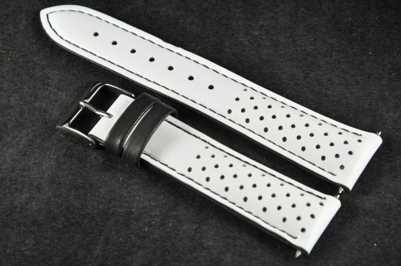 Skórzany pasek wykonany ze skóry typu nubuk. Perforowany wierzch z widoczną kolejną, kolorową warstwą skóry. Mocno pogrubiany do 5,5mm, przy zapięciu pocieniany do 3,6mm. Przyszyty nicią w kolorze czarnym, brzegi i szlufki w kolorze nici. Podwójna szlufka, stalowa klamerka. Pasek nadający sportowego charakteru.