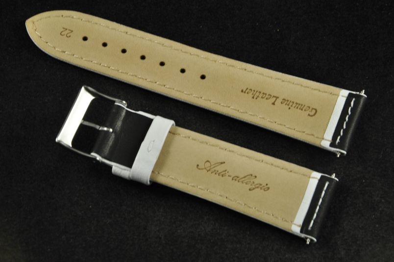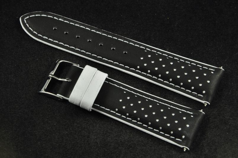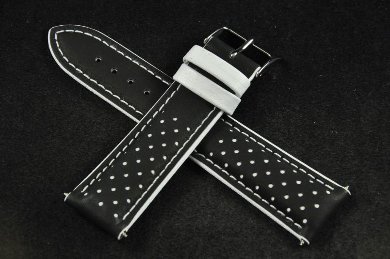 Skórzany pasek wykonany ze skóry typu nubuk. Perforowany wierzch z widoczną kolejną, kolorową warstwą skóry. Mocno pogrubiany do 5,5mm, przy zapięciu pocieniany do 3,6mm. Przyszyty nicią w kolorze białym, brzegi i szlufki w kolorze nici. Podwójna szlufka, stalowa klamerka. Pasek nadający sportowego charakteru.